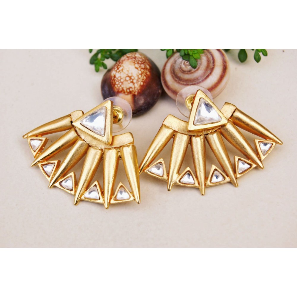 Our first design in the latest trend of the upcoming season. Ear jacket with an Indian twist. Ear jackets are basically stud earrings that hug the ear lobe. In this piece they are plated with matte gold and have triangular kundan studs. A distinct blend of ethnic and modern design sensibilities. Wear these to parties or weddings depending on how fancy you like to get. Easy to pair with both western and ethnic Indian attire.