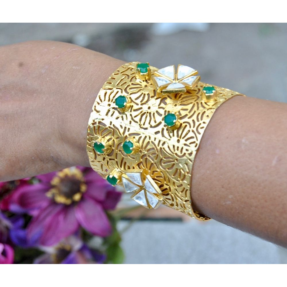 Product Description : A new design in cuff bracelets. This bracelet is made with semi precious gemstones. The bracelet is studded with pretty green emerald gemstones . The bracelet is bold and broad and has filigree work done all around. Polki diamonds are studded on the bracelet in flower formation to enhance and highlight the design. It has a fine gold plating. Contemporary, yet stylish this is the latest trend in cuff bracelets. Being Indo Western in look, this bracelet can be adorned as an attractive accessory with both ethnic and western attire.Wear for an evening out, be it parties, celebration or even formal occasions like marriages and festivals. The bracelet makes a distinguished fashion statement.