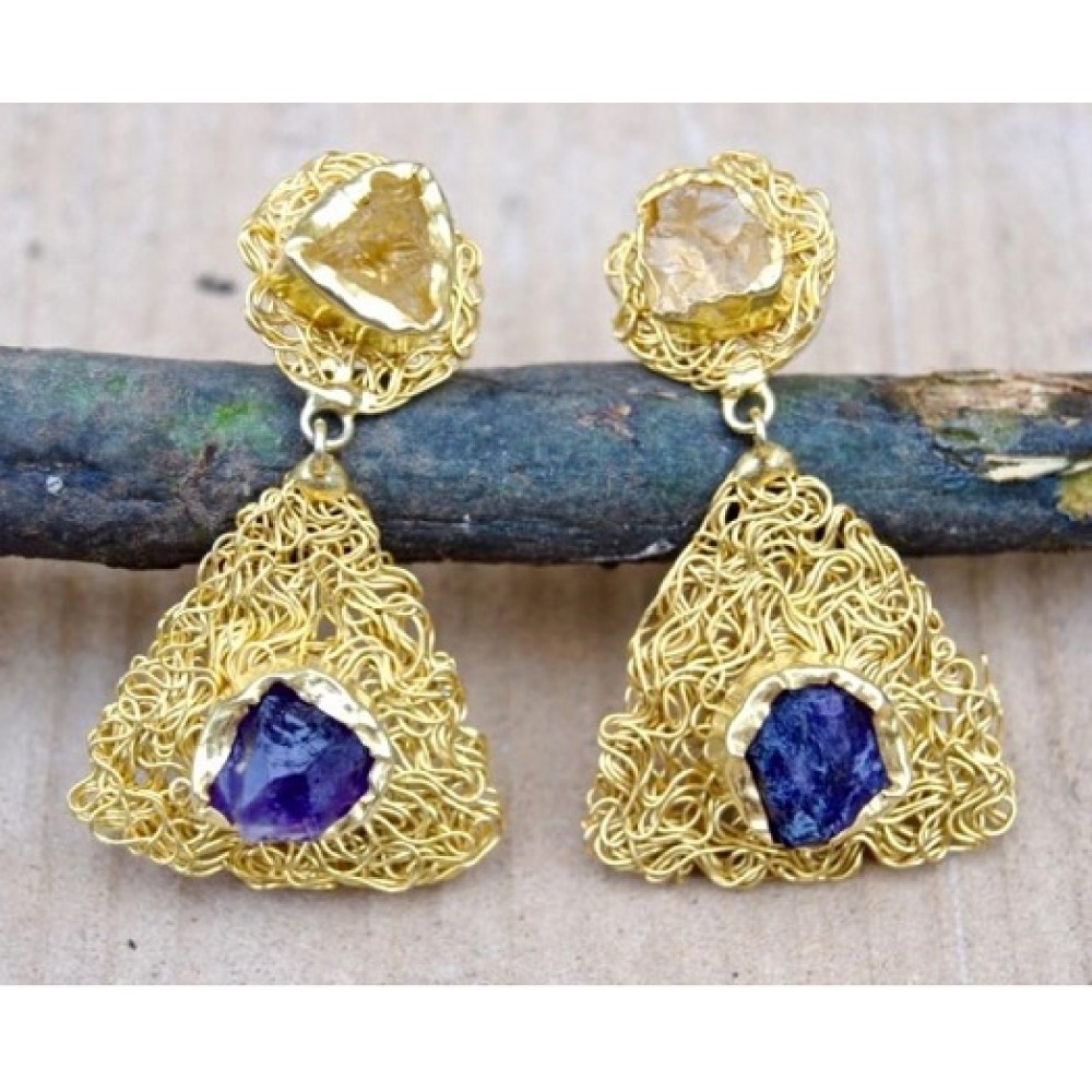 Product Information : A fashionable dangler drop earring made from semi precious gemstone. The druzzy stone in contrasting colours are embedded in gold meshed dangler earrings.The earrings have gold polish. A very unique design these earrings are very light weight.. Perfect to wear to parties and celebrations. Being indo western they can be paired with ethnic Indian as well western outfits.