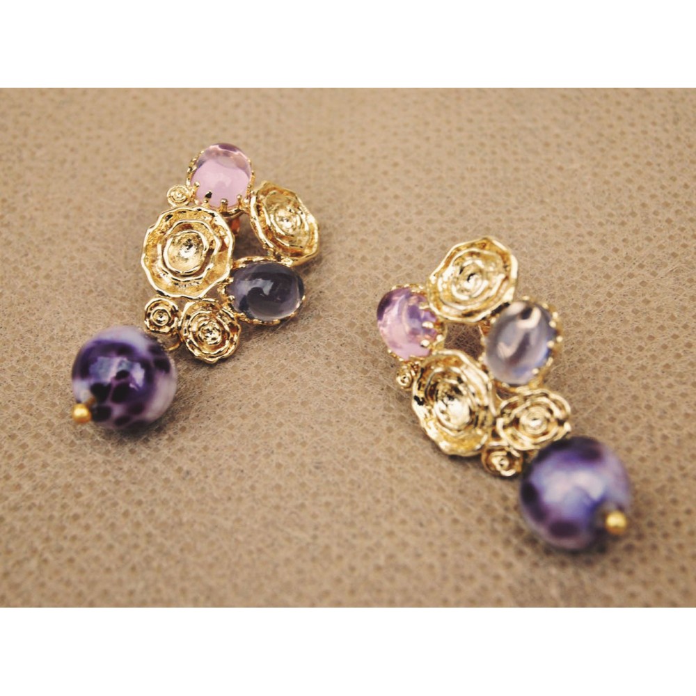 Product Description : Very pretty rose bouquet earrings studded with pink and lilac cubic zirconia stones and finished with a matching agate drop. The earrings are made with a brass alloy which is plated with 16 carat gold and has 92.5 sterling silver posts which is great for those who are sensitive to non-precious metals. Best worn to work or for parties or to work, these are lightweight and will carry you through the day. Wear easily with ethnic or western wear.
