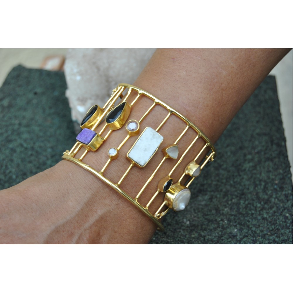 Product Description : A new design in cuff bracelets. This bracelet is made with semi precious gemstones. The bracelet is studded with pretty multi-colored and varied shaped druzy gemstones . The bracelet has a fine gold plating. Contemporary, yet stylish this is the latest trend in cuff bracelets. Wear for an evening out, be it parties, celebration or even festivals. The bracelet makes a distinguished fashion statement.