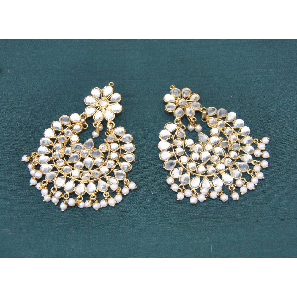 Lightweight kundan like chand bali earrings with dangler pearls. Perfect for those who want the glamorous look without the weighing your ears down. Check Specifications for sizing and material information.