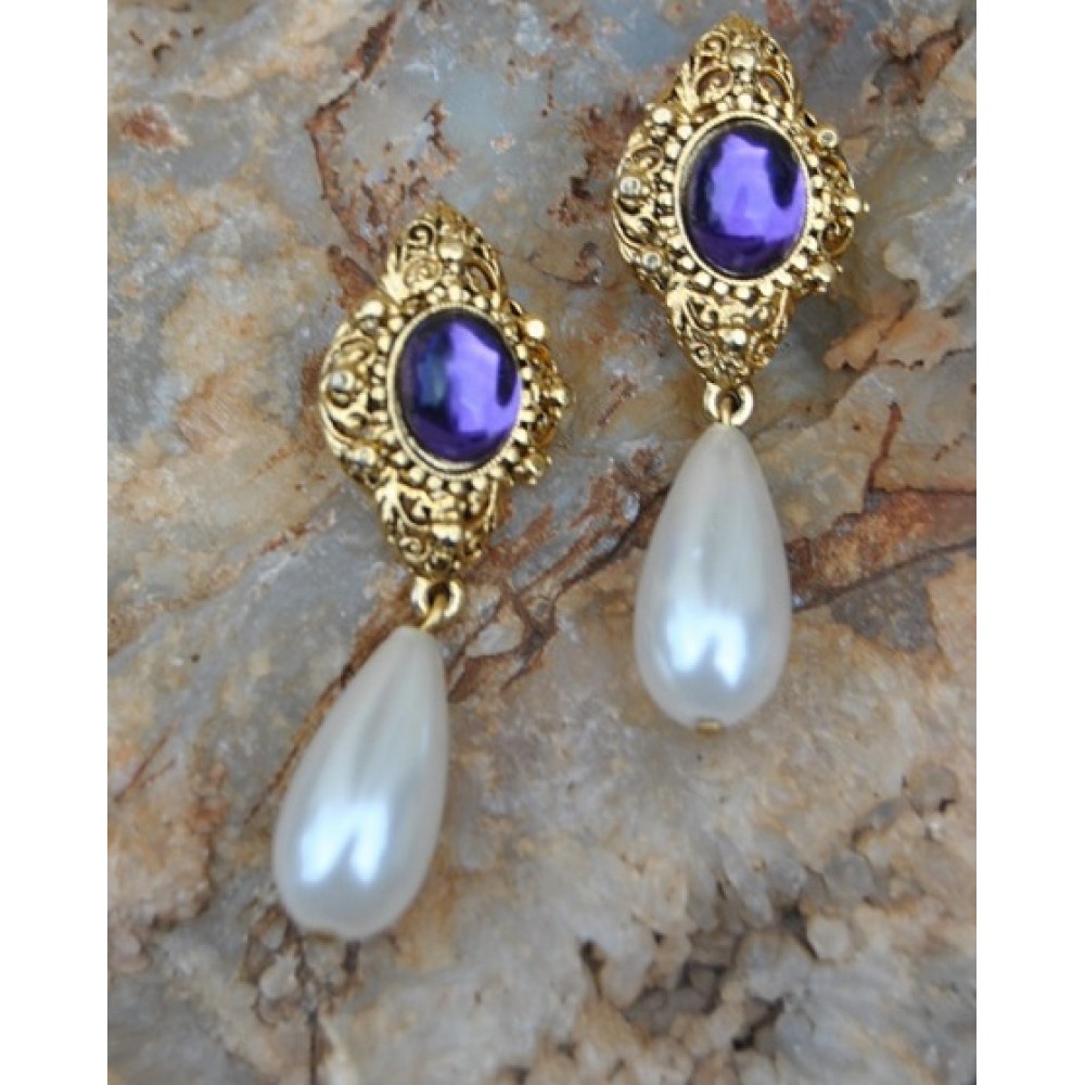 A new look in dangler earrings. These are made of semi precious gemstones. A single pearl dangles from a gold stud. A pretty purple onyx placed in the centre of the stud lends it a vibrant touch. These earrings with a contemporary design will blend with all types of dress code. Wear them to weddings andcelebrationsProduct Detail :