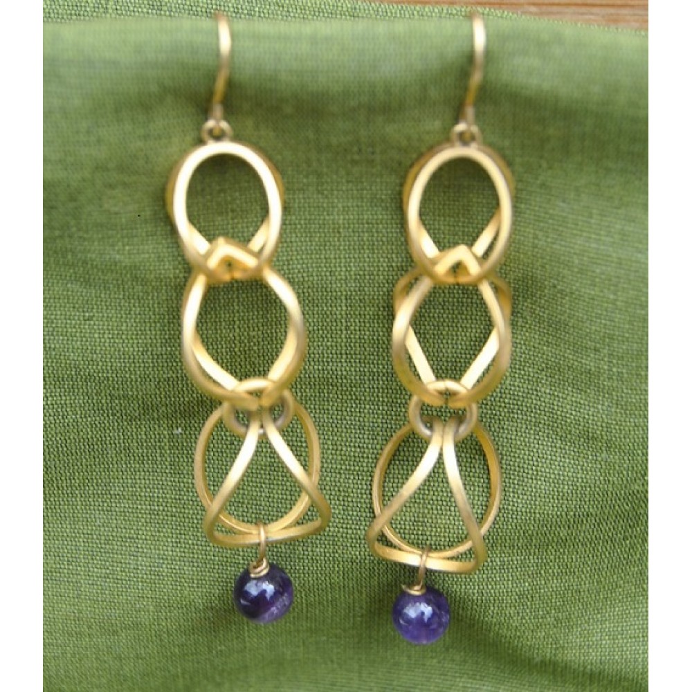 A new look in dangler earrings. These are made of semi precious gemstones. A single delicate Amethyest dangles from a twirl designed gold dangling top. . Dainty and delicate, these earrings with a contemporary design will blend with all types of dress code. Wear them to parties and celebrationsProduct Detail :