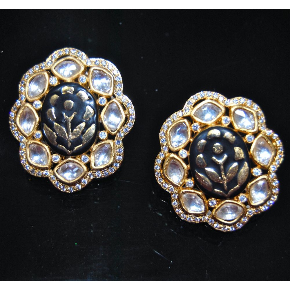 These kundan meena stud earrings are simply breathtaking. Kundan stones are made to shine with a silver foil plating in the back. Small diamond studding all over, 18K carat gold plating and a lovely gold etched black meena centre make these come together.
