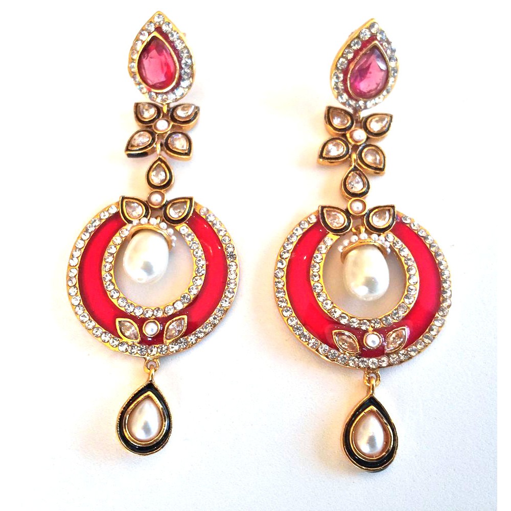Absolutely marvelous long earrings finished with hot pink enamel. The perfect pairing for any pink traditional outfit. These will not disappoint. Kundan stones are outlined with black enamel that gives it a marked elegance. Finally a pearl drop that minimizes negative space.