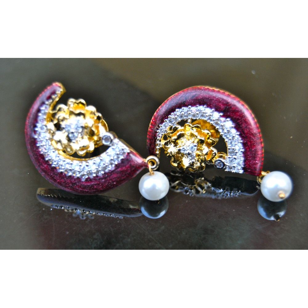 Product Description : Two parts of a whole, two peas in a pod. Anyway you think of them, these earrings spell pretty in an understated way. These earrings have beautiful gold plated cluster flower at the centre whose buds are made of american diamonds.These are then surrounded by another two rows of diamonds. The part that brings these all together is the lovely enamel work, also known as meenakari in maroon color that forms the outermost border. Relatively smaller is size, these are also very light in weight and a great pair to have in your closet that can be used to dress up or for a casual night out. Recommended for pairing with both indian and western outfits. This is a well crafted and well priced pair of earrings that you must have in your closet. Also available in green and black. See below.