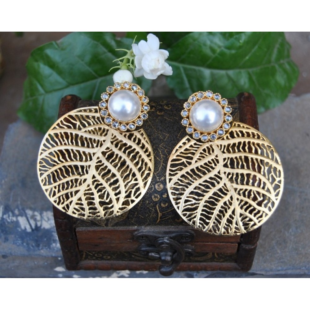 Product Information : Part of the Mohanna collection, these pieces all use exceptionally high quality semi-precious gemstones which makes it hard to tell that these are not precious jewelery. It has a beautiful floral stud with a round pearl. The pearl is bordered with crystals on each petal . A lovely gold frame with filigree work forms the dangler. The dangler earrings have a matte gold polish Fashionable and delicate these are perfect to adorn at formal gatherings. Being indo western in style pair them with ethnic as well as western outfits. Wear them to weddings and celebrations. See specifications tab for dimensions.