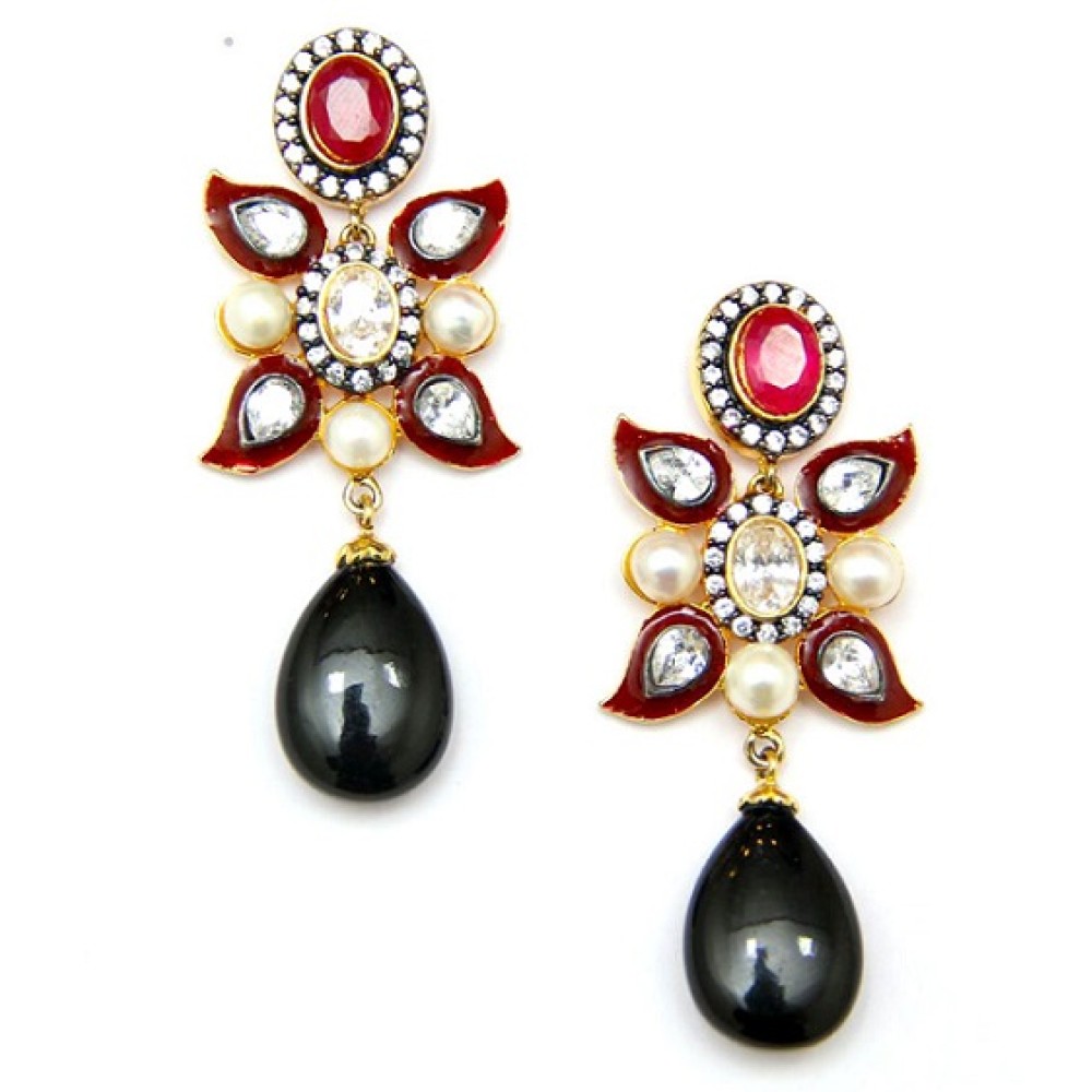 These exquisite earrings have much to recommend them. The stud is created ruby surrounded by diamonds. The body gets a classic look with the pearls. A black onyx drop is offset by the beautiful maroon (meena) accents which tie them together with the rubies. Great detail and exquisite craftsmanship make these a joy to own.