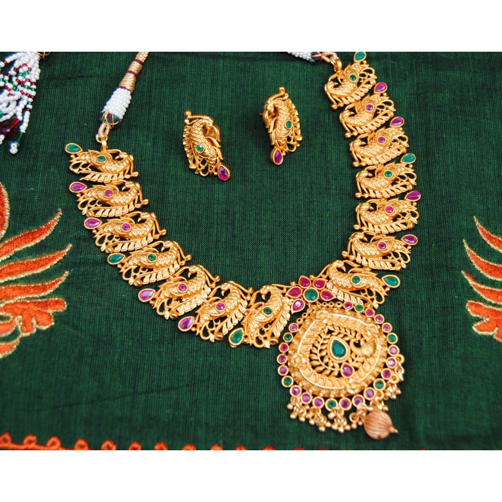 Product Description : Charming ethnic necklace set . The necklace set is designed with pretty dancing peacocks studded with rubies and emerald with an attractive pendant. The ethnic Indian necklace set is made of an alloy and plated with a fine antique gold polish with a lovely pair of delicate dangler earrings in a unique design.. Ethnic Indian jewelery that is lightweight and great for wearing at festive occasions and wedding functions. Pair with traditional Indian wear like sarees, salwar suits and lehengas.