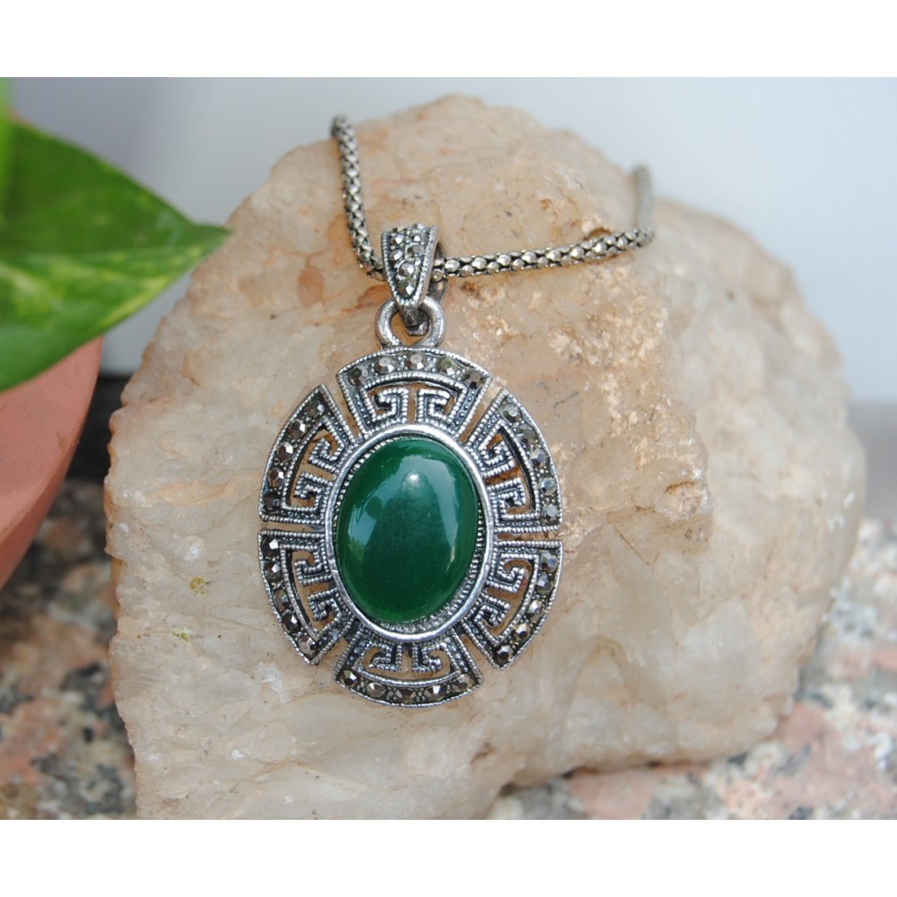 Product Description : A pretty stylish oval pendant necklace piece. Beautifully designed with an oval green onyx and bordered with attractive marcasite gemstones. It has an oxidised silver polish finish and an attractive matching chain Earn appreciative glances with this classic and affordable necklace.