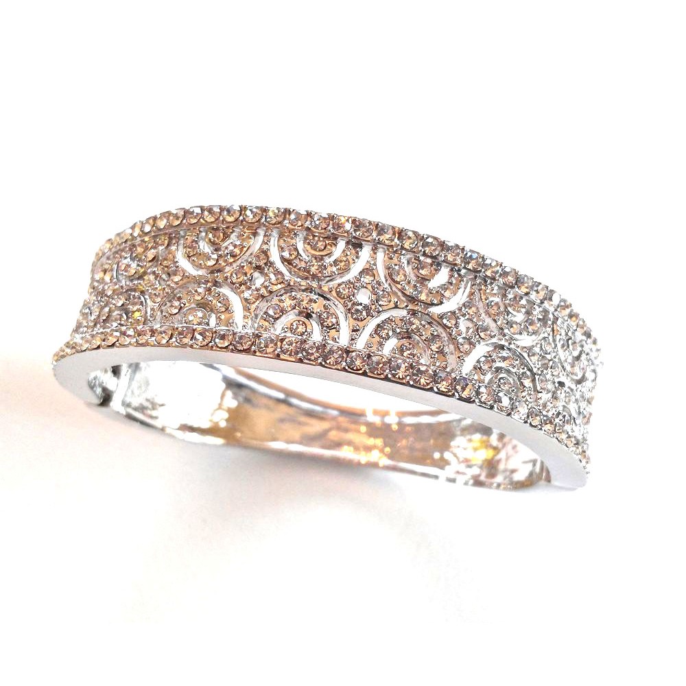 A stunning work of art that will add finesse to any outfit. High quality white gold plated hinged bracelet that is studded with diamonds. Also available in gold.