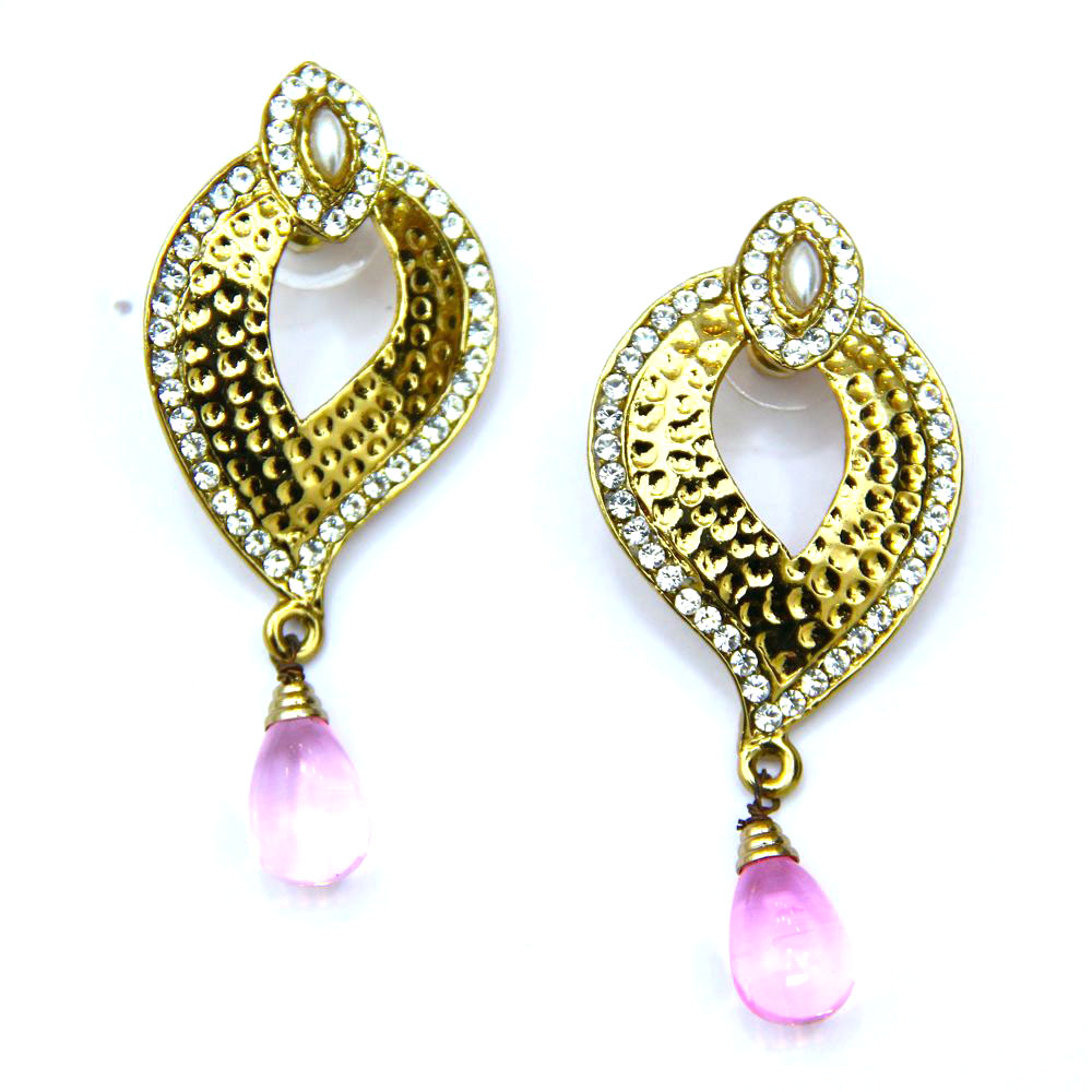 Lovely feminine gold plated earrings bordered with diamonds and finished with a lovely pink drop.